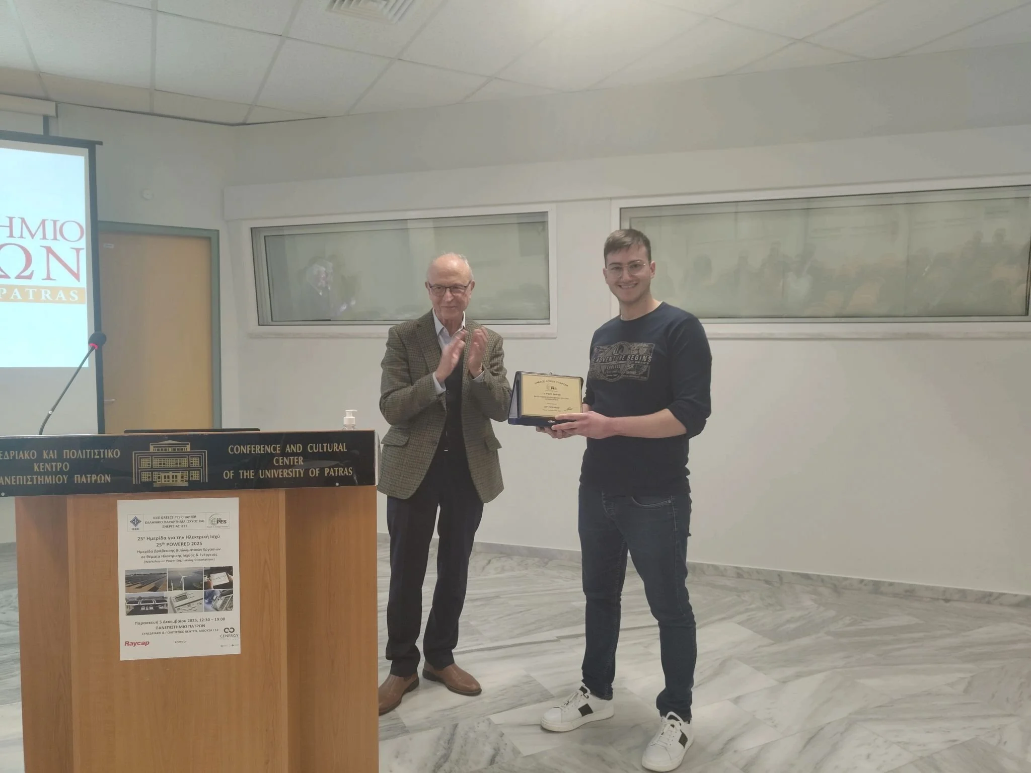 Our ECE Department at the University of Patras hosted the Workshop on 𝗣𝗼𝘄𝗲𝗿 𝗘𝗻𝗴𝗶𝗻𝗲𝗲𝗿𝗶𝗻𝗴 𝗗𝗶𝘀𝘀𝗲𝗿𝘁𝗮𝘁𝗶𝗼𝗻𝘀 – 𝗣𝗢𝗪𝗘𝗥𝗘𝗗 𝟮𝟬𝟮𝟱, organized by the IEEE Greece Power and Energy Society Chapter. During the event, recent Electrical Engineering graduates presented their final-year project dissertations in the field of power and energy systems. We are proud to announce that the first prize was awarded to Sotirios Filippas (now part of the ENRICH team) for his dissertation titled “Design and Development of a High Power Density DC/DC Converter using Gallium Nitride Devices”, conducted under the supervision of Assistant Professor Georgios Kampitsis.